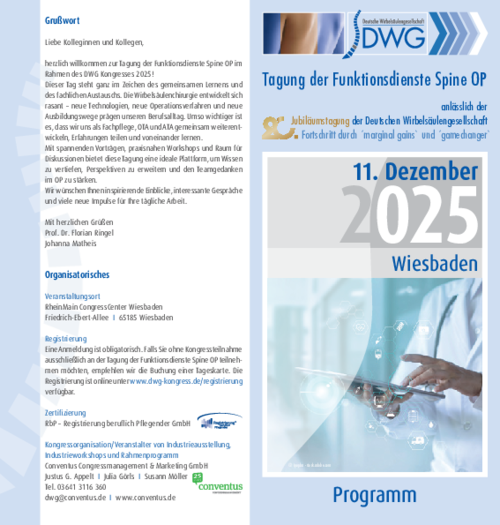 herzlich willkommen zur Tagung der Funktionsdienste Spine OP im Rahmen des DWG Kongresses 2025! Dieser Tag steht ganz im Zeichen des gemeinsamen Lernens und des fachlichen Austauschs. Die Wirbelsäulenchirurgie entwickelt sich rasant – neue Technologien, neue Operationsverfahren und neue Ausbildungswege prägen unseren Berufsalltag. Umso wichtiger ist es, dass wir uns als Fachpflege, OTA und ATA gemeinsam weiterentwickeln, Erfahrungen teilen und voneinander lernen. Mit spannenden Vorträgen, praxisnahen Workshops und Raum für Diskussionen bietet diese Tagung eine ideale Plattform, um Wissen zu vertiefen, Perspektiven zu erweitern und den Teamgedanken im OP zu stärken. Wir wünschen Ihnen inspirierende Einblicke, interessante Gespräche und viele neue Impulse für Ihre tägliche Arbeit. Tagung der Funktionsdienste Spine OP anlässlich der Jubiläumstagung der Deutschen Wirbelsäulengesellschaft
