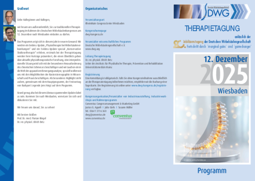 wir freuen uns außerordentlich, Sie zur traditionellen Therapietagung im Rahmen des Deutschen Wirbelsäulenkongresses am 12. Dezember nach Wiesbaden einladen zu dürfen. Das Programm zeigt sich in diesem Jahr in neuem Gewand: Wir werden ein Evidenz-Update „Physiotherapie bei Wirbelsäulenerkrankungen“ und ein Evidenz-Update spezial „Konservative Skoliosetherapie“ erleben, erstmals bei der Therapietagung werden freie Vorträge präsentiert, die einen Überblick geben über aktuelle physiotherapeutische Forschung, eine interprofessionelle Sitzung wird sich mit der besonderen Herausforderung des chronischen Schmerzes beschäftigen und wir tauchen ein in die Welt der apparativen Bewegungsanalyse, speziell wollen wir uns mit den Möglichkeiten der Rasterstereographie in Wissenschaft und Praxis beschäftigen. Als besonderes Highlight steht zudem, gemeinsam mit dem Hauptprogramm, der Festvortrag von Radsport Legende Jens Voigt auf dem Programm. Grund genug also bei diesem überaus spannenden Update dabei zu sein. Kommen Sie nach Wiesbaden, vernetzen Sie sich und diskutieren Sie mit. Wir freuen uns darauf, Sie zu sehen!